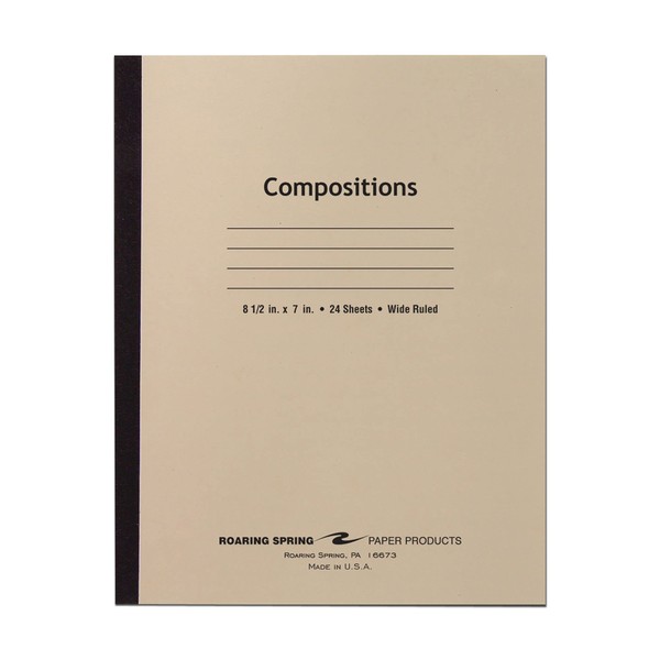 Record your notes in this permanently bound composition book. Paper is smooth 15# writing paper with wide ruled blue lines. There is no margin line. Covers are a 7 pt manila tag. Each book is produced with center-sewn and tape bound construction, not designed for sheet tear-out. Sheet size is 8.5" x 7" and there are 24 sheets per book.
