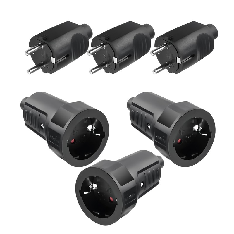 Schuko Plug Coupling: Schuko Plug Outdoor 250 V 16 A IP54 Without Cable 2-Pin External Rubber Coupling and Waterproof Black Schuko Plug 3 Pairs