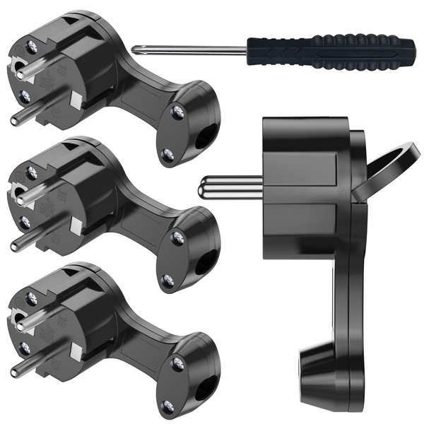 Schuko Plug, Flat Flat Plug, Angled Plug 230 V, Power Plug with Folding Handle, Protective Contact Plug, Splash-proof and Durable, IP44, Shatterproof, Black, 4 Pieces, Black