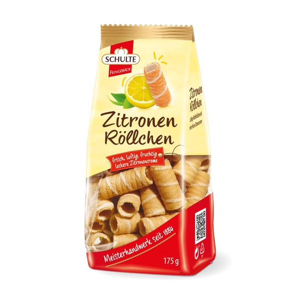 A round thing. With Schulte lemon rolls, you do not look into the tube. Taste the crispy specialties and experience the fruity taste of the fine lemon cream, which is located on the inner wall of the delicious waffle rolls. The crispy pastry is also an ideal side dish for coffee or tea.