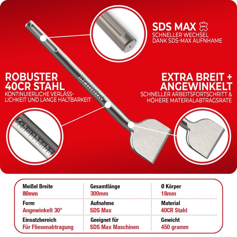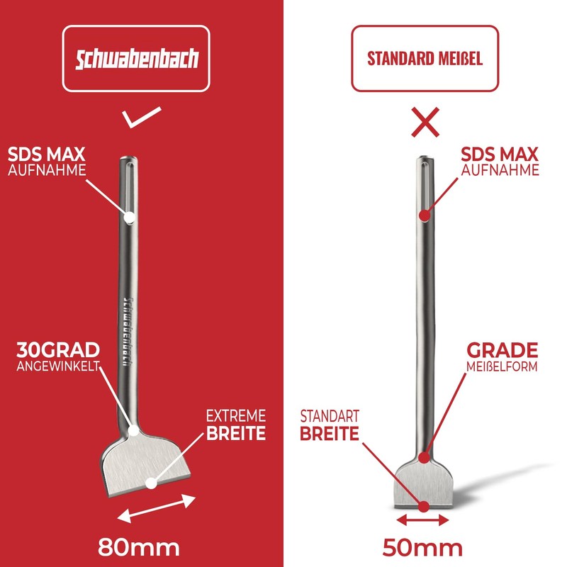 SCHWABENBACH® SDS MAX Tile Chisel 300 x 80 mm Angled - Tile Removal Tool - Ideal for Removing Plaster - Flat Chisel - Extra Hardened Tip - Hammer Drill Chisel 80 mm for Professionals
