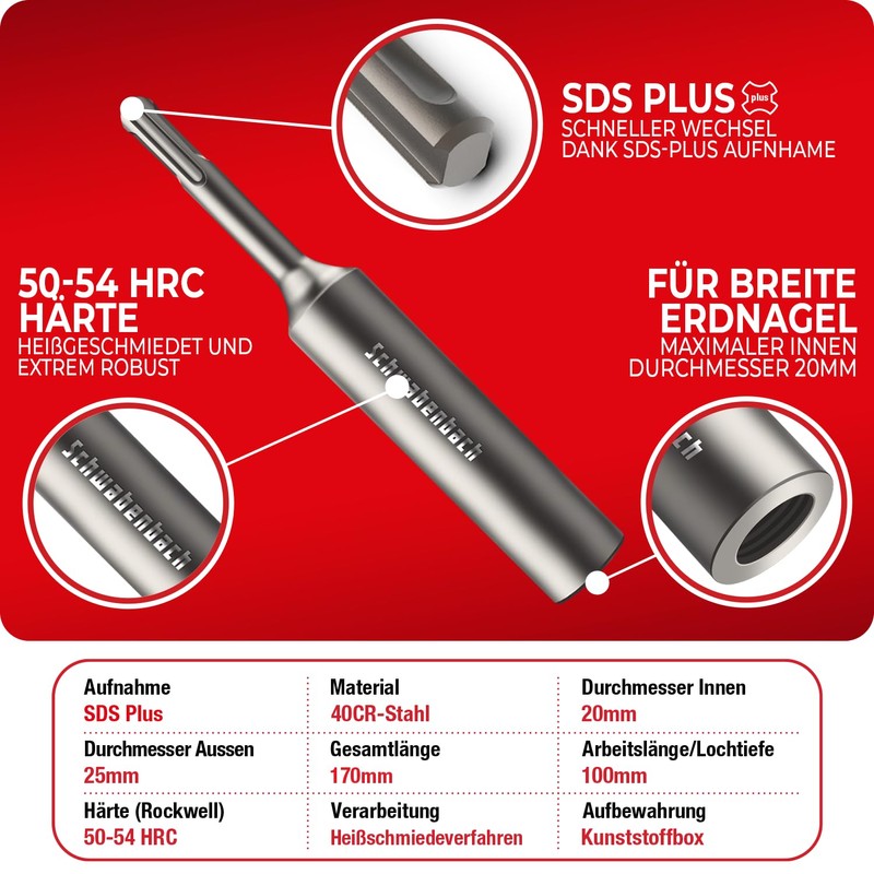 Schwabenbach ® SDS Plus Ground Nail Driver for Inserting Deep Earth 170 x Diameter 25 mm, Inner Diameter 20 mm, Ground Spike