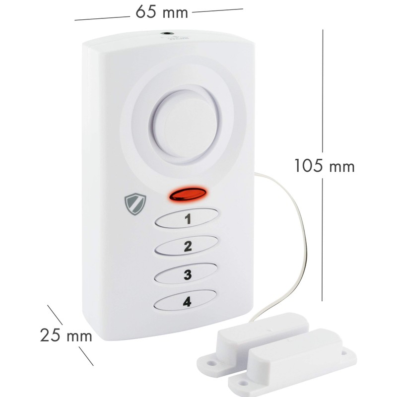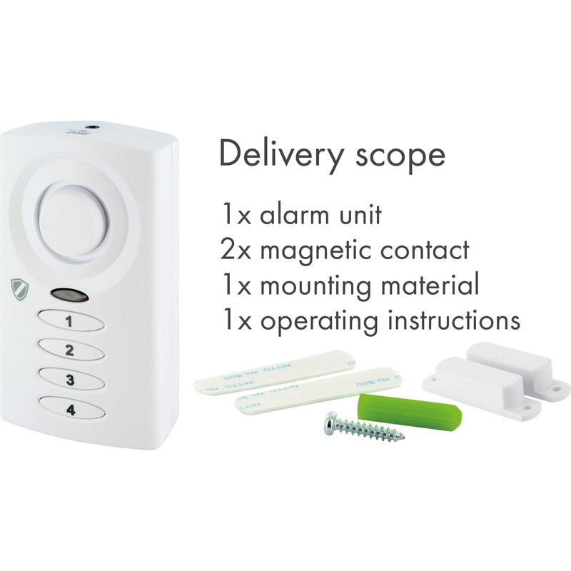 - Box contents: alarm unit, 2 x magnetic contact, mounting material, as well as a detailed instruction manual (English language