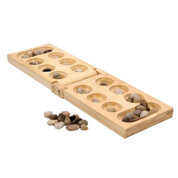 Each player's goal is to collect the glass beads in their mancala (the large cups at each end of the game board). Start your game by filling each cup (except Mancalas) with 4 beads. A player then retrieves beads from a cup and distributes them individually into other cups around the board. A few simple rules govern which cups a player can drop a bead into and when it is a player's turn. Collect the most beads in your mancala to win the game! The classic counting game for all ages. Ideal for children and adults. Perfect game for camp and travel.