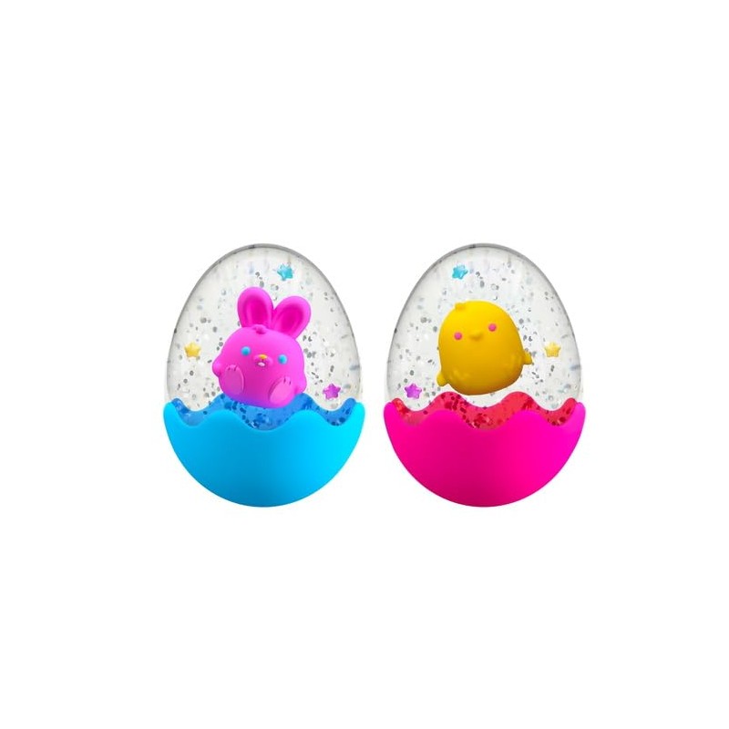 - A magical enclosed globe of water movement with confetti, glitter, and an adorable Easter critter
