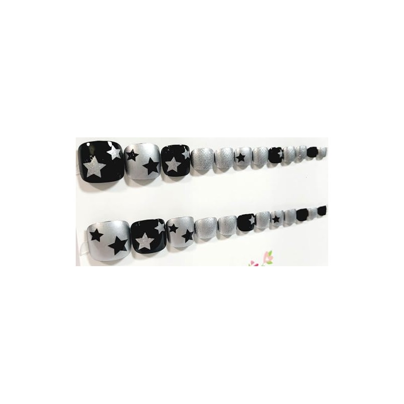 Sci-Fi Love Glossy Press-On Nails - 24 Pieces - Artificial Nail Kit (Black, Silver, Toenail)