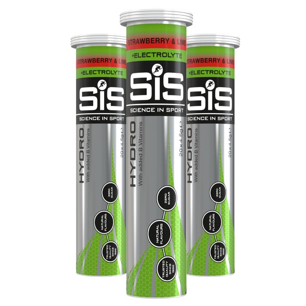 Science In Sport Hydro Hydration Tablets, Gluten-Free, Zero Sugar, Strawberry and Lime Flavour Plus Electrolytes, 20 Effervescent Tablets per Bottle (3 Bottles)