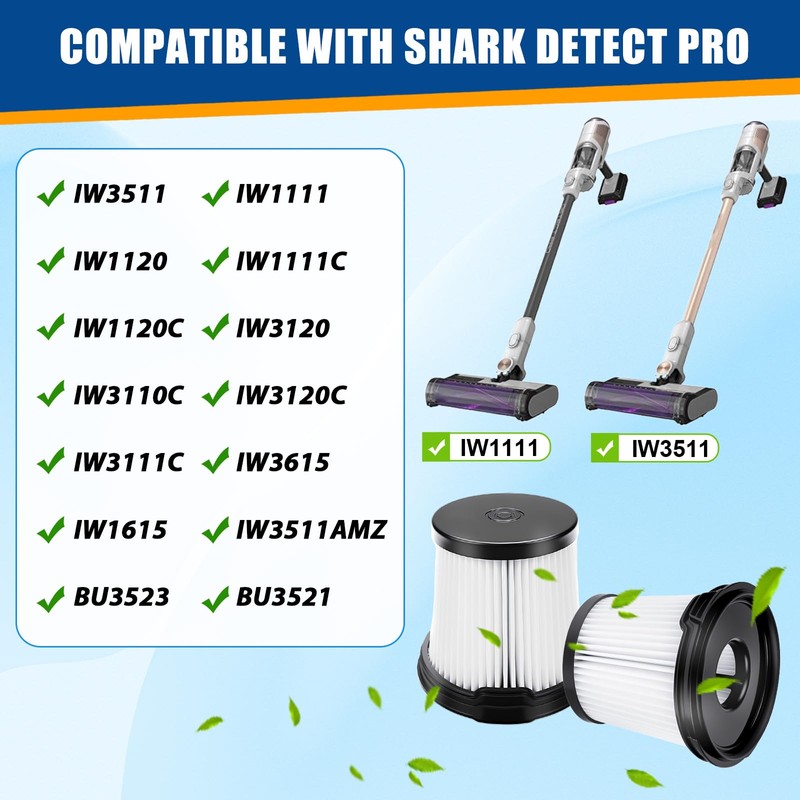- Compatible with Shark detect pro: IW3511 replacement filters is perfect compatible with Shark detect pro cordless stick vacuum IW1000, IW1111, IW1111C, IW1120, IW1615, IW1120C, IW3000, IW3110C, IW3111, IW3111C, IW3511, IW3511AMZ, IW3120, IW3120C, IW3615, AMZIW3615, IW3615CCO, IW1615QBL, IW1615QBR, IW1615QGN, IW1615QPR, IW1615QSL upright vacuum. Just make sure to check your model to ensure a proper fit.