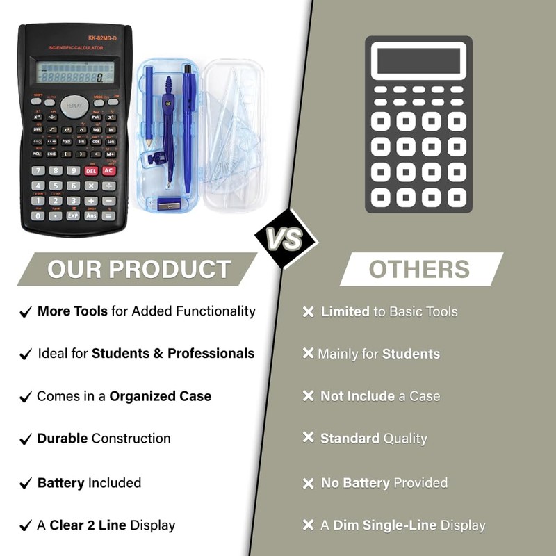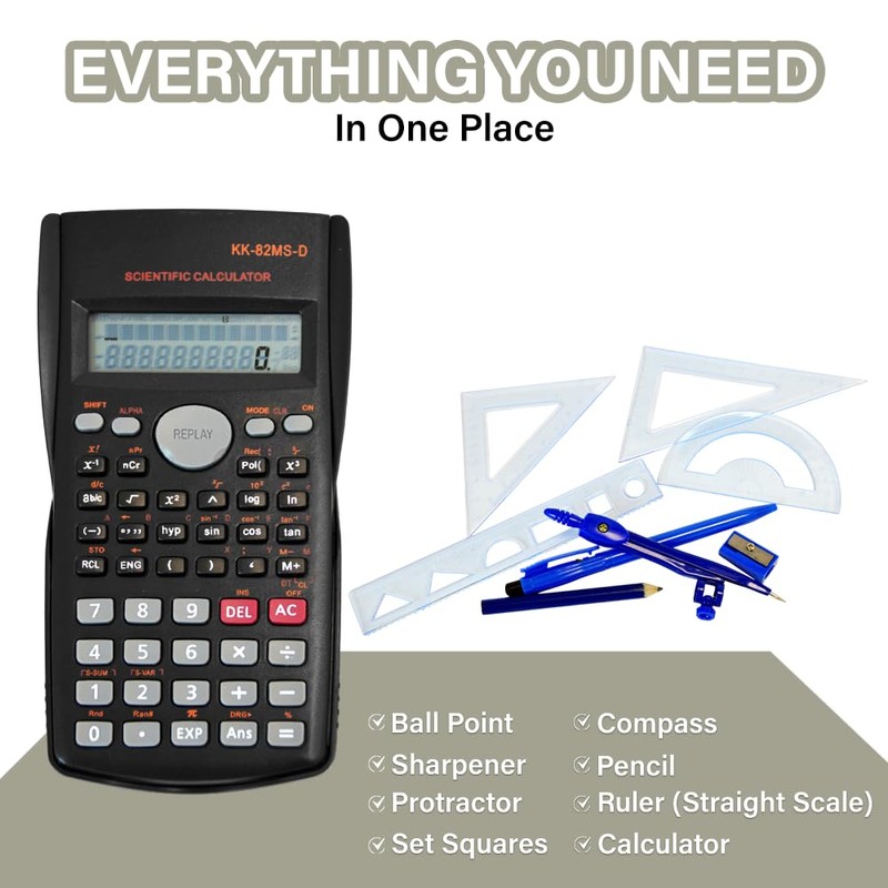 - Package Includes: 1 x Scientific Calculator (240 Functions, 2-Line HD Display) 1 x Clear Geometry Case with 8 tools (compass, protractor, set squares, ruler, pen, pencil, and sharpener). Batteries Included: Ready to use immediately.