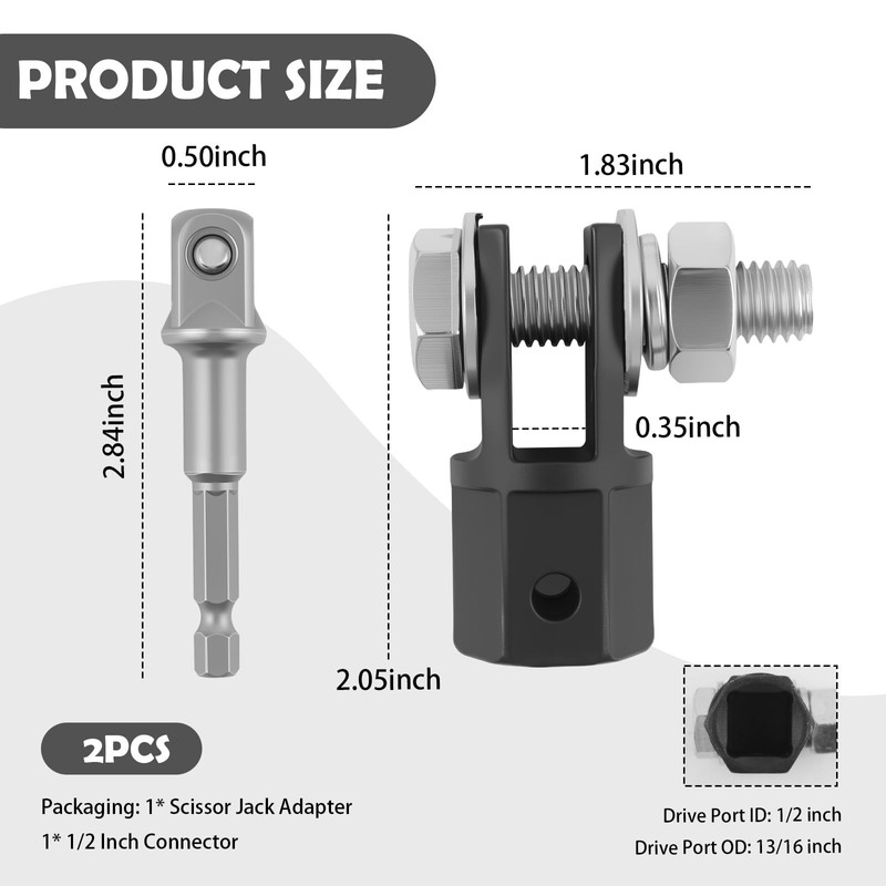 - Product Specification: Scissor jack adapter total size is 2.05*1.83 in, the ID of the drive port is 1/2 in, the OD is 13/16 in, the spacing between the top and bottom of the adapter is 0.35 in, and the total size of the 1/2" connector is 2.84*0.50 in