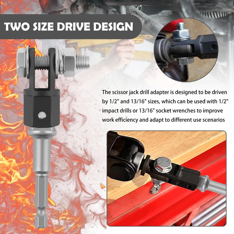 - Two Size Drive Design: The scissor jack drill adapter is designed to be driven by 1/2" and 13/16" sizes, which can be used with 1/2" impact drills or 13/16" socket wrenches to improve work efficiency and adapt to different use scenarios
