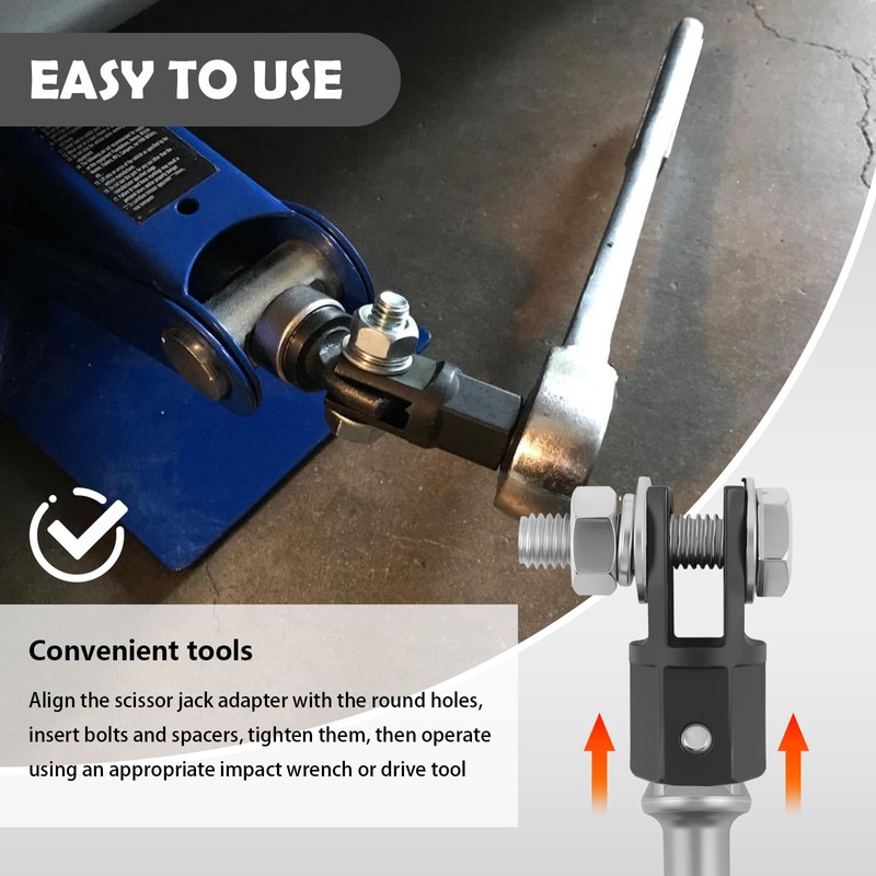 - Easy to Use: Align our scissor jack adapter and place it between the corresponding round holes in the jack, put the bolts and spacers into the holes respectively, and screw them, then you can drive it with the right impact wrench and drive tool