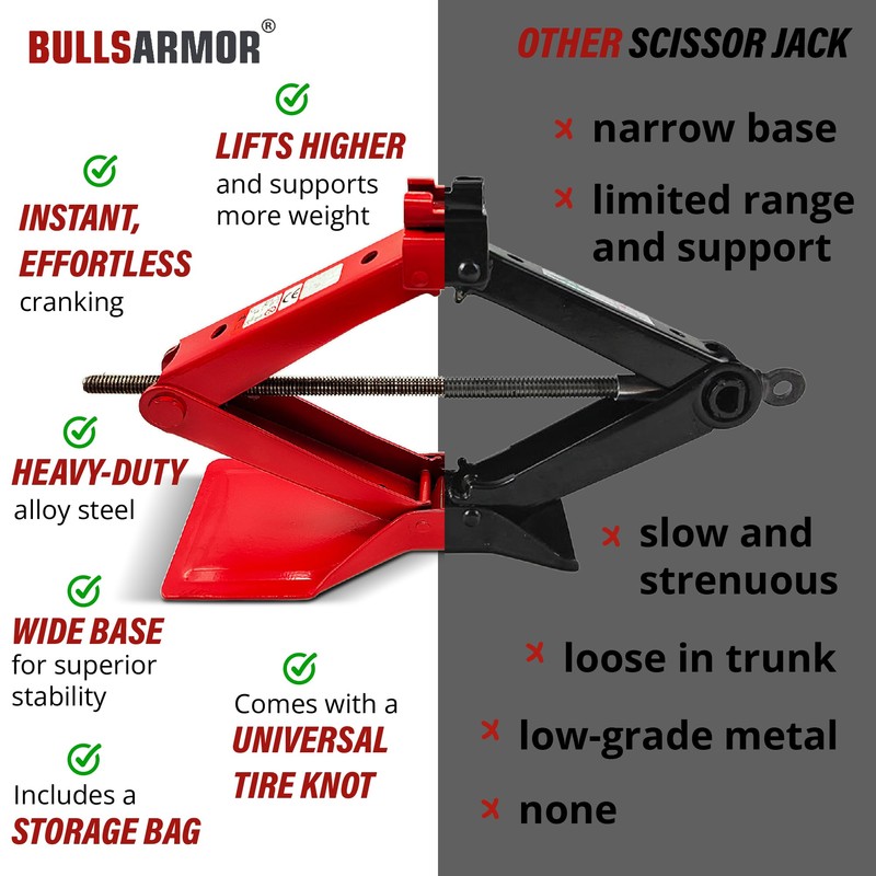BullsArmor Scissor Jack Kit - 2 Ton (4,400 lbs) - Extra Wide Base - Universal...