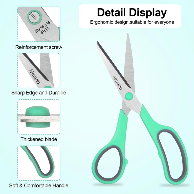 - Almarto soft-grip 8 inch scissors: Measures approximately 8 by 3.0 by 0.4 inches, It is also Grate for Back to School, Christmas gift, Birthday gift, Mother's Day, Craftng, DIY Day, Father's Day, Colleague, Valentine's Day, Thanksgiving Day, Party, Happy New Year's Gift Idea. WARNING: keep out of reach of children, Not for children under 5 yrs.