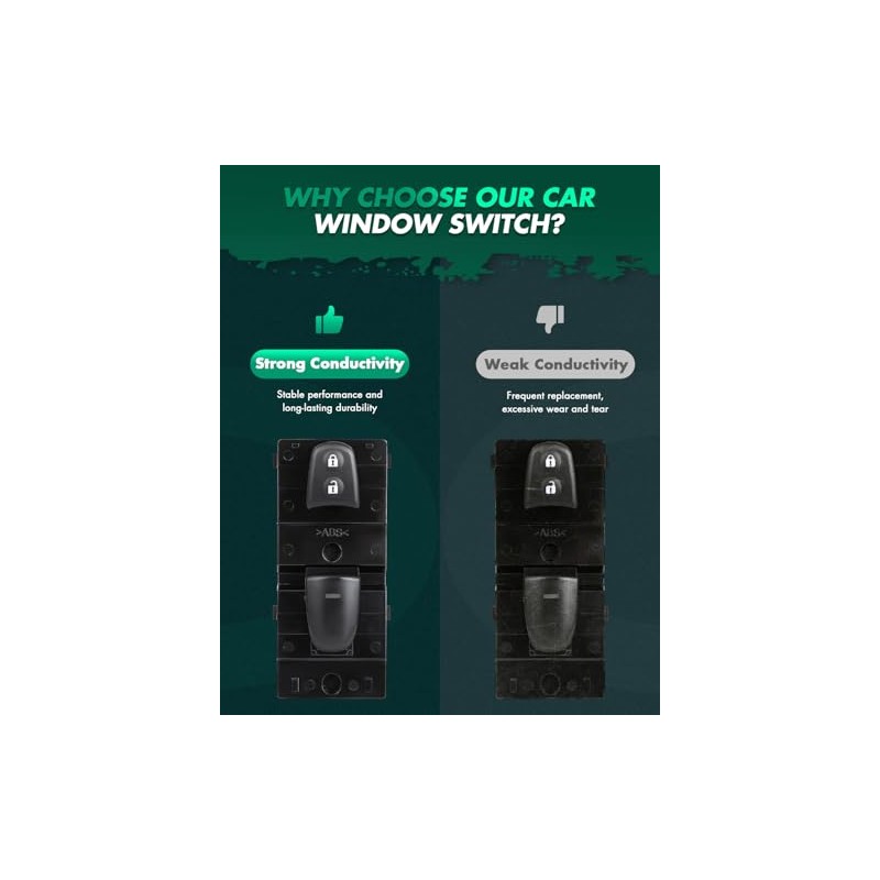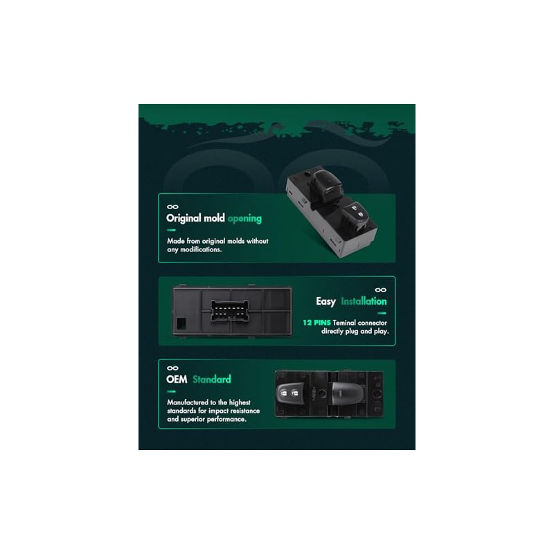 - Specifications: Location:Front Right; Housing Material:Plastic; Color:Black; Terminal Quantity:12; Switch Type: Power Window Switch