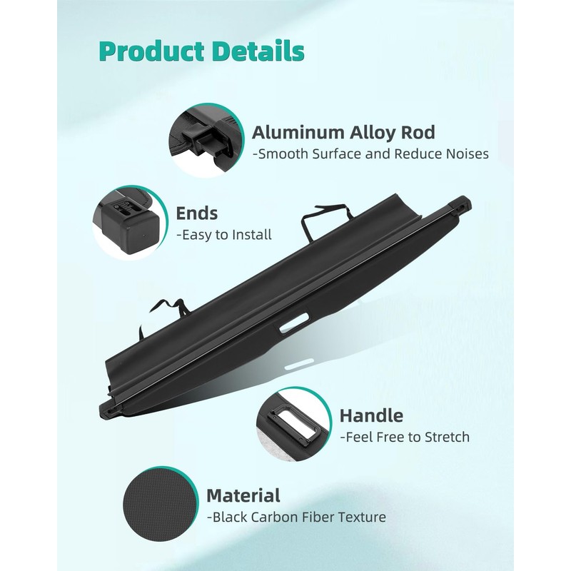 • [ Top Quality ] Built with a sturdy aluminum frame and durable PVC, the retractable rear trunk cover is tear-resistant, pressure-resistant, and easy to maintain. Plus, integrated soundproof cotton minimizes interior scratches and reduces driving noise. Perfect for enhancing both functionality and security.