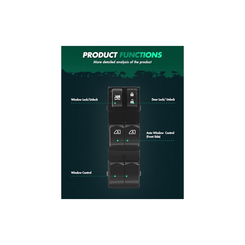 - Specifications: Location:Front Left; Housing Material:Plastic; Color:Black; Terminal Quantity:2+14; Switch Type: Driver Side Power Master Window Switch