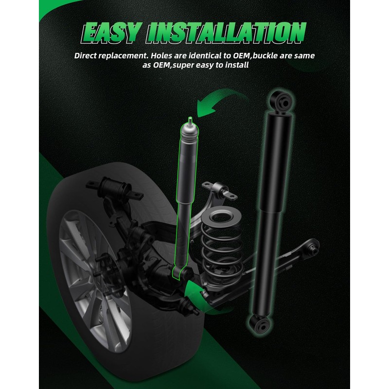 - FEATURE: Our shock absorbers are made from premium materials, designed to withstand harsh road conditions and enhance vehicle comfort. Built to last, they offer the durability and reliability you can trust. With a simple installation process that requires basic hand tools like a wrench and socket wrench, upgrading your vehicle is straightforward