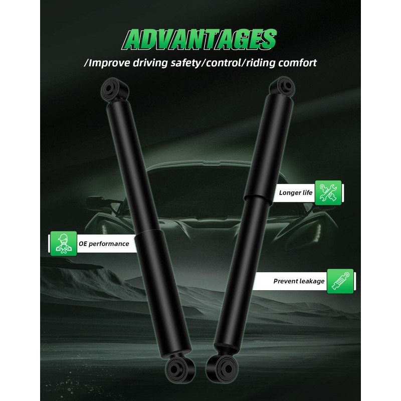 - FUNCTION: Upgrade your driving experience with our premium designed shock absorbers. Designed with advanced technology, they effectively absorb road shocks and reduce vibrations, ensuring a smoother ride on any terrain. Whether you're commuting daily or taking a long road trip, these shock absorbers will improve your vehicle's performance and comfort