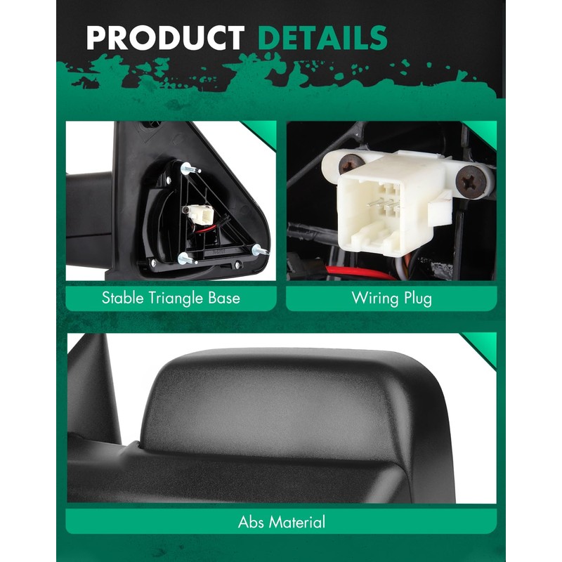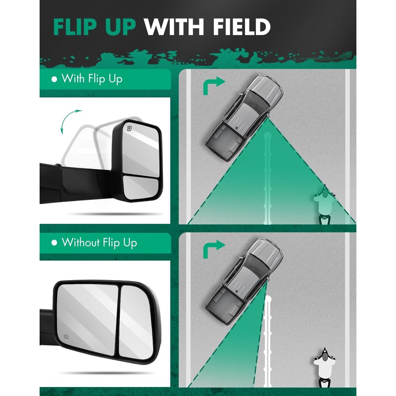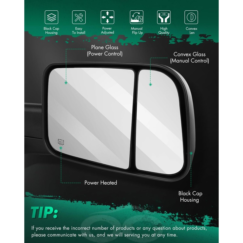 • [Functions]: This Towing Mirros is Equiped with Power Adjusted,Heated,No Turn Signal Light,with Black Cap Housing,Manual Folding and Flip Up