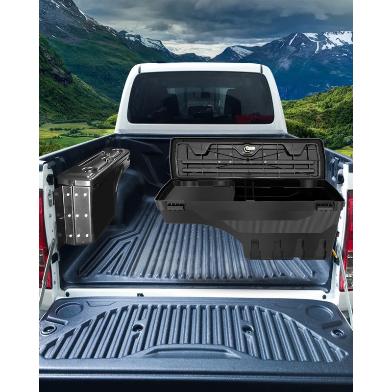 • Saving Use Space : Mount the truck bed box to the wall of the bedrail on either the left or right side. Pull the latch to make it pivot 193°, convenient for using. And not us, tool box can fold up to save space.