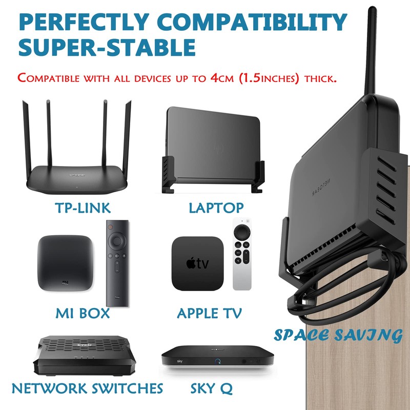 - Universal vertical support – perfect accessory for routers such as TP-Link, Huawei, Asus, Netgear, Tenda etc. For TV box such as Xiaomi Mi Box, Apple TV, Sky Q min i, Android TV Box, etc.