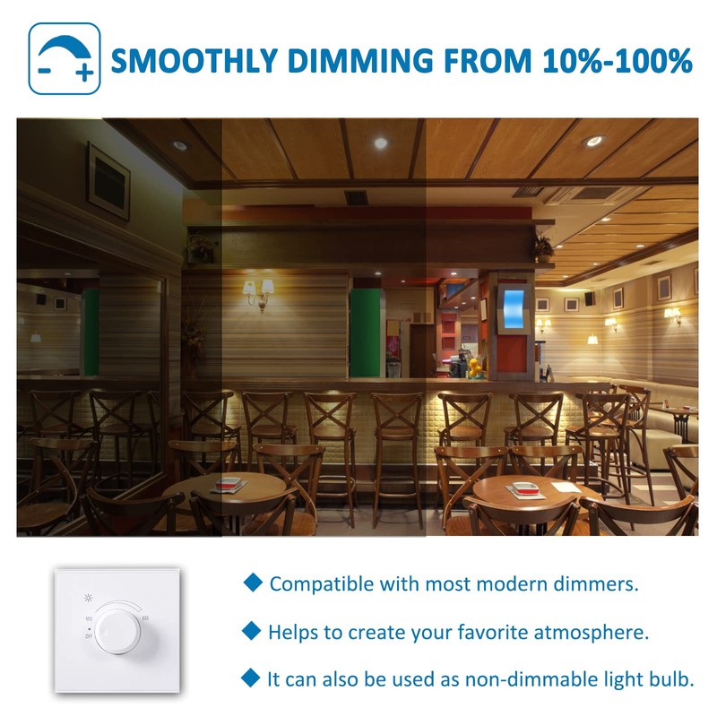 - ???????????????Warmwei? 2700K, 100% dimmbar, sofortige Beleuchtung ohne Verz?gerung, schaffen eine warme und angenehme Lichtumgebung. Wenn die Glhbirne blinkt, berprfen Sie bitte die Dimmerkompatibilit?t.