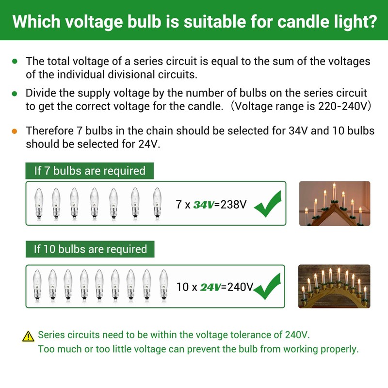 • ?ANWENDUNGSM?GLICHKEITRiffelkerze 24V 3W E10 ist geeignet fr Schwibb?gen, Lichterb?gen oder Weihnachtspyramiden, Lichterketten im Innenbereich. Ideale Ersatzbirnen fr Weihnachtskranzlichter, Kandelaber, Weihnachtskerzenbrcken, Spitzkerzen und mehr.