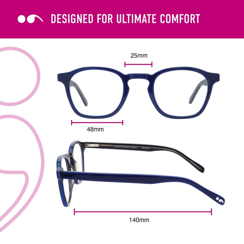 - CONFIDENCE IN ACTION: A modern vintage that speaks volumes. Christopher Street readers are designed for the straight shooter. For trailblazers who aren’t afraid to stand up for what they believe in. For you. With a striking silhouette accentuated by an attention-grabbing serving of color, these blue light readers capture the spirit of bold New York. And as part of our Handmade Collection, they stand out with high-quality acetate and finished with a diligent tumbling and polishing process.