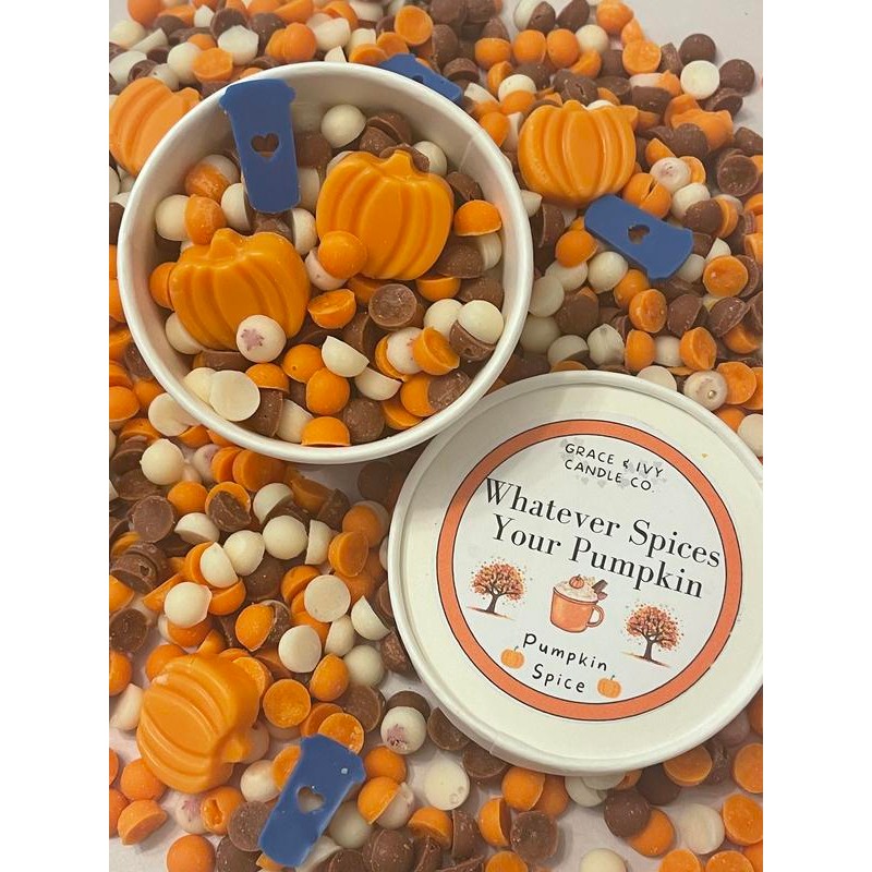 WHATEVER SPICES YOUR PUMPKIN - A cup of our cream and brown dots mixed with wax-melt expresso beans. Topped with a pumpkin, coffee cup wax tarts & a wax spoon! This is all scented in our delicious toasted pumpkin spice scent.