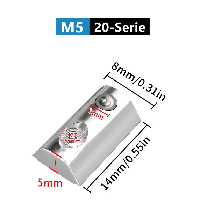 • ★ Groove width: 6 mm, profile size: EU20, screw size: M5; dimensions: 14 x 8 x 5 mm; fits 20 series aluminium profile extrusion slots according to European standard