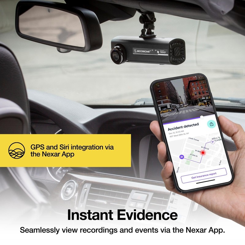 The Scosche NEXC2128-XCES0 Full HD two-way recording, smart dash camera captures important visual evidence of accidents or events right from your vehicle. Instantly report incidents to your insurance company with detailed evidence of the crash such as (video, speed, direction of travel, license plates, faces and force of impact) which stores on the 128GB of internal memory. Quickly and securely mount the camera to the vehicles dash or windshield using the suction cup mount. The 1080P, 155-degree wide angle front forward-facing camera lens provides a clear view of objects for capturing the best shots and video in front of the vehicle, while the 720P, 140-degree rear facing interior lens captures everything inside the vehicle. Record high quality video at night or in low light with the ultra-low light visibility and high dynamic range. Equipped with a highly accurate G-sensor which detects incidents and records impact severity. Use the auto-loop recording to seamlessly record new footage over previous footage. Includes free storage for keeping significant events and trip data in the Nexar cloud and is compatible with the Nexar safe driving app with 24/7 support for iPhones and Android mobile devices. Seamlessly view recordings, events and integrate your GPS, Siri and Google assistant using the Nexar app. Connects to WiFi with great speeds which provide a secure, reliable connection. Each package comes with a NEXC2 full HD dash camera, 24W dual-port (12W each) USB car adapter, suction cup mount for camera, 10 ft. 90-degree USB power cable, ties and installation tools. We back this amazing camera by Scosche's Lifetime Tech Support and 1-year warranty.