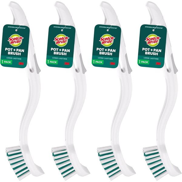 Scotch-Brite Pot + Pan Brush, Durable and Long Lasting Dish Brush with Handle for Scrubbing Stainless Steel, Outdoor Furniture, and Sinks without Scratching, Antimicrobial, and Rinses Clean