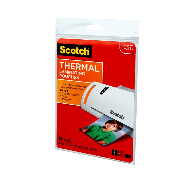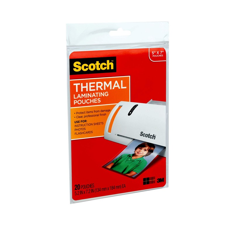 For use with Scotch Thermal Laminator or any standard thermal pouch laminator. 5 mil thick thermal laminating pouches offer superior thickness for laminating photos and other items up to 5x7 inches. These pouches provide a glossy finish and instant 2-sided protection for frequently handled documents.