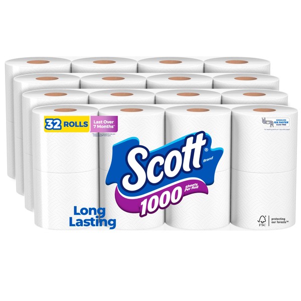 - 32 regular rolls of Scott 1000 Toilet Paper—packaging may vary from images shown.