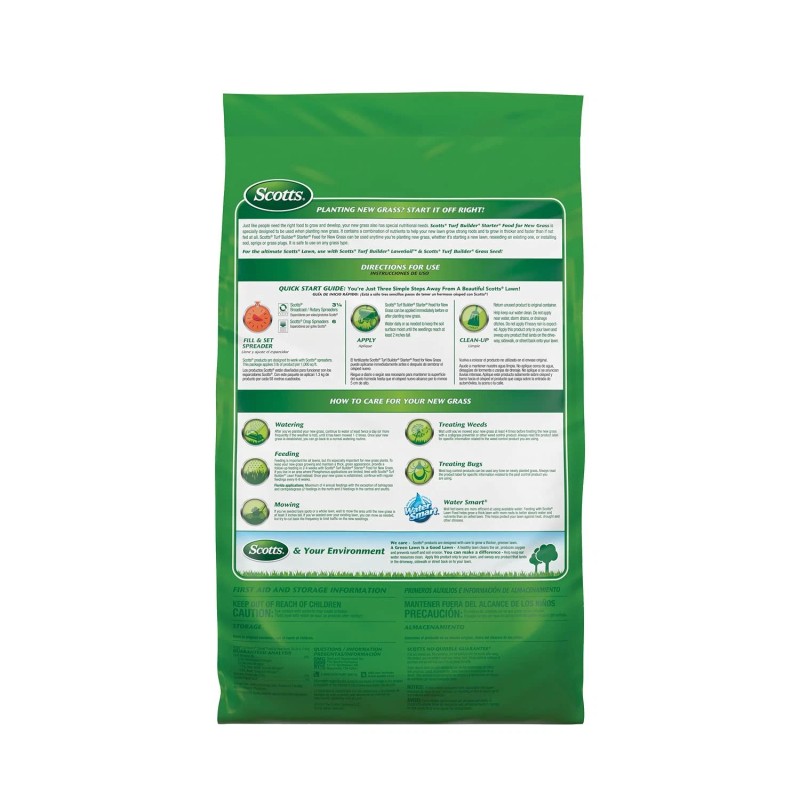 Scotts® Turf Builder® Starter® Food for New Grass is designed to be used when planting seed, growing new grass 70% thicker and 35% quicker (on average vs. unfed lawns). Crafted with the exclusive Scotts® All-in-One Particles® technology, this formula blends the ideal ratio of nutrients into each individual particle. Use anytime you are planting new grass, whether it is starting a new lawn, reseeding an existing one, or installing sod, sprigs, or grass plugs. Scotts® Turf Builder® Starter® Food for New Grass is safe to use on any grass type. It can be applied immediately before or after planting grass. We recommend using a Scotts® spreader to apply this product. For Scotts® broadcast/rotary spreaders, use a setting of 3 ¼. For Scotts® drop spreaders, use a setting of 6. Water daily or as needed to keep the soil surface moist until the seedlings reach at least 2 inches tall. One 42 lb. bag of Scotts® Turf Builder® Starter® Food for New Grass covers 14,000 sq. ft.