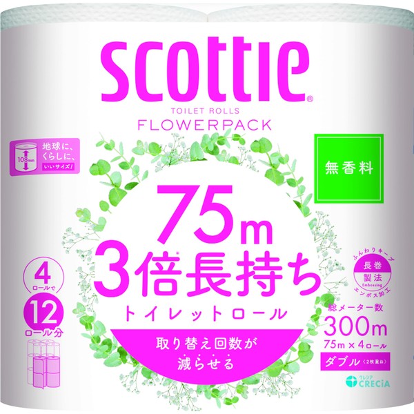 Scottie Flower Pack, 3x Long-Lasting, 4 Rolls, 25.4 ft (75 m), Double, Unscented