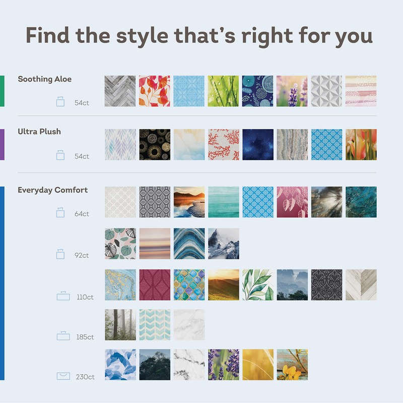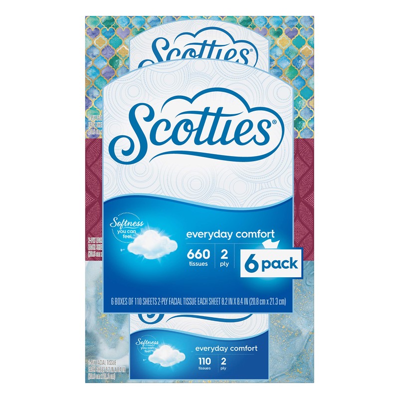 - Scotties Everyday Comfort 2-ply is available in cube, flat and reach-in box formats and come in a wide variety of designs to fit any room.
