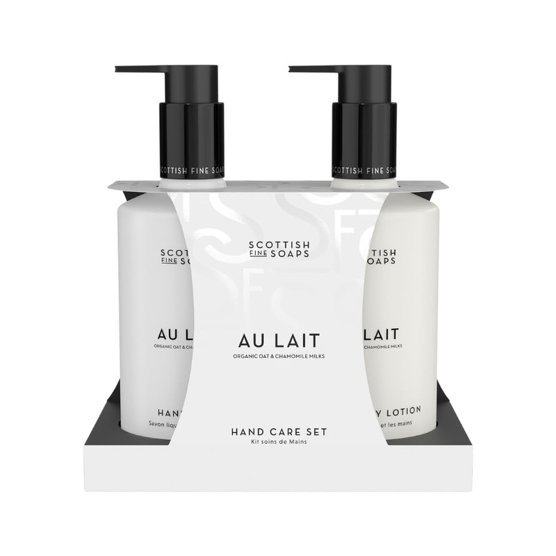 - The Au Lait hand care set contains: liquid soap 300 ml, hand and body lotion 300 ml
