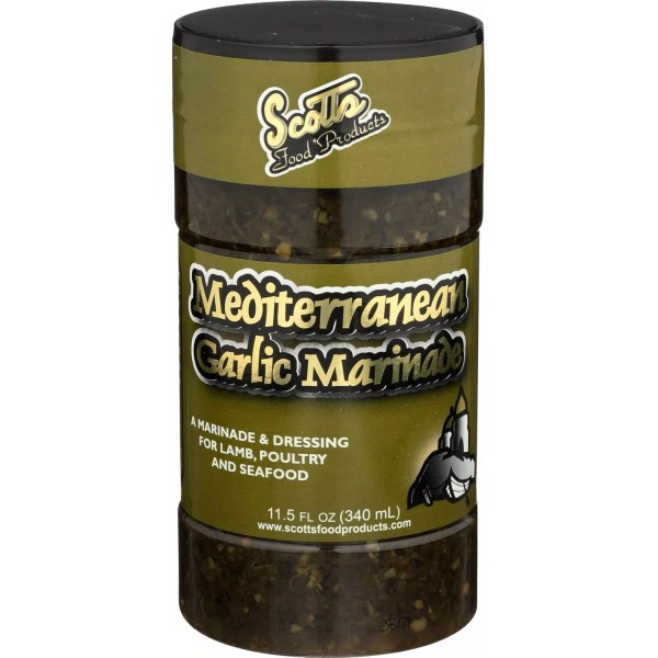 Scott's Food Products Mediterranean Garlic Marinade features a canola oil base blended with garlic and spices for a delicious addition to seafood, poultry, lamb, and vegetables. This sauce also makes a tasty salad dressing or topping for garlic bread. Each 11.5 fl. oz. container contains approximately 23 servings at 105 calories each.