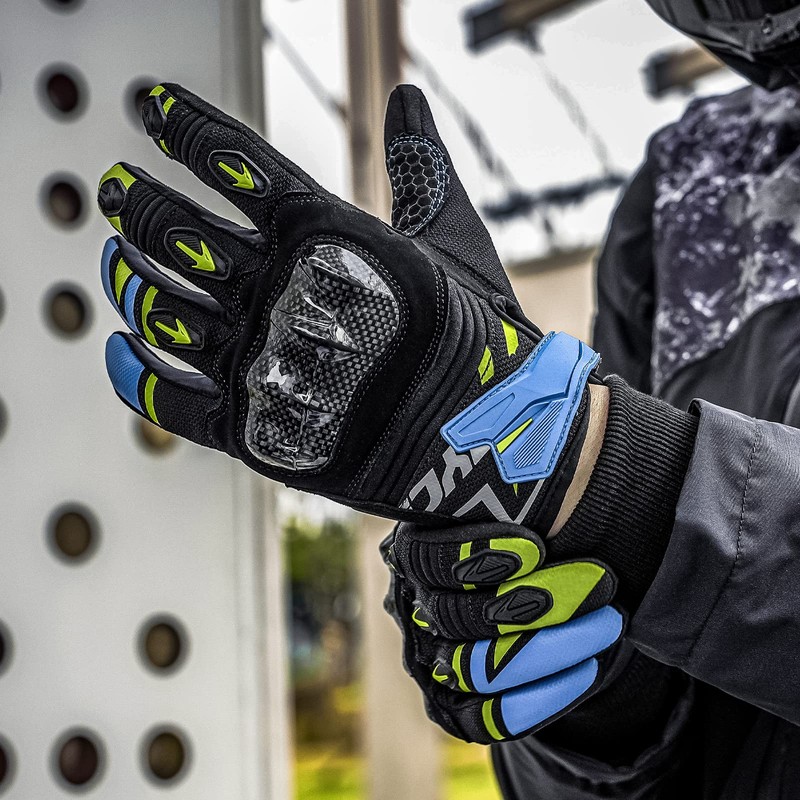 - 【Carbon Knuckle Guard】Ergonomic design with innovative carbon knuckle guard on backhand, PVC protection for index finger, middle finger and ring finger, keep fingers and knuckles from getting injured and bruised. With TPU protection on the hand side can keep hands from abrasions and fractures. Ideal motorcycle gloves for street and urban use.