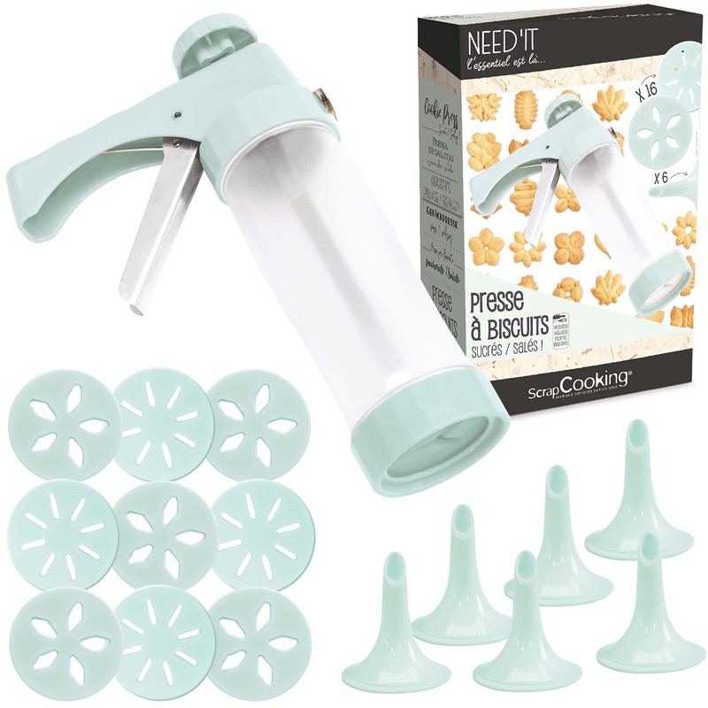 - Biscuit press with 22 different designs, with which you can easily prepare savoury or sweet biscuits in seconds
