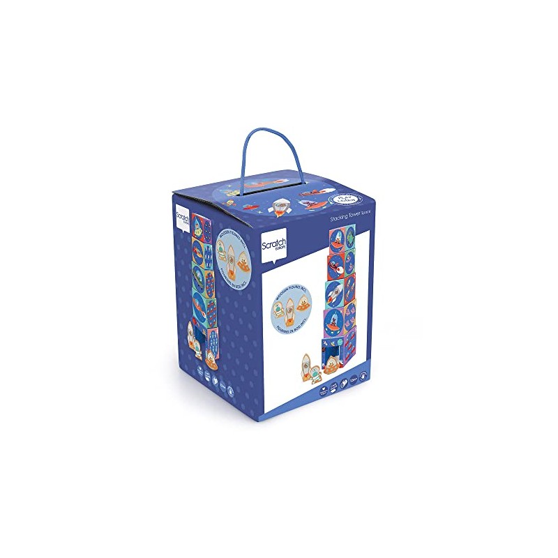 - The colourful illustrated stacking tower contains five cubes in different sizes and three cool wooden figures (spaceships).