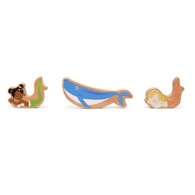 - The colourful illustrated stacking tower contains five cubes in different sizes and three cute wooden figures (2 mermaids and 1 whale).