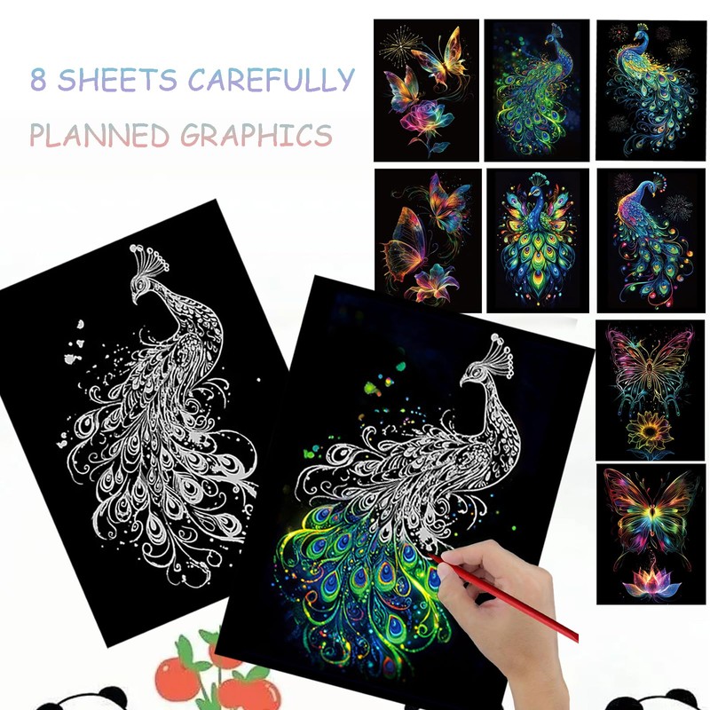 Scratch Art Paper for Adults, 8 Sheets 11.2 x 8.2 inches,Rainbow Scratch Art DIY Craft Gift 5 Paint by Scratch Tools ( Butterfly & Peacock)
