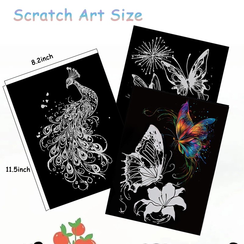 - Diverse Designs- Scratch art adult with 2 captivating designs - Butterfly and Peacocklooks beautiful, full of texture, colorful patterns, you just need to scratch the gray area with a scratching brush, each scratch will bloom brightly, as if opening a fantasy world of art.