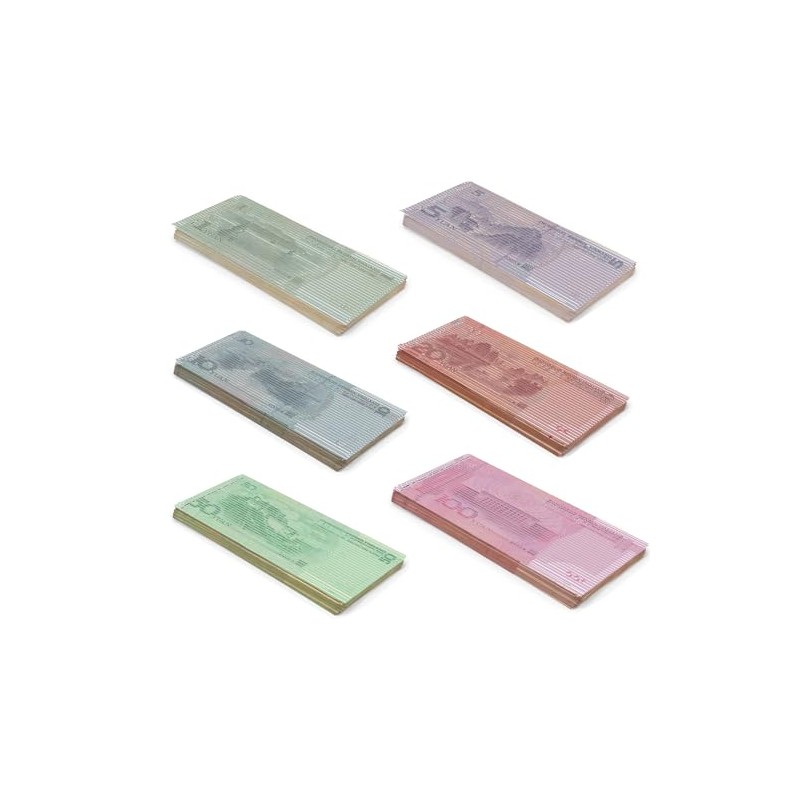 - Each pack contains 150 banknotes, 6 bundles of 25 x 1, 5, 10, 20, 50 and 100 yuan.