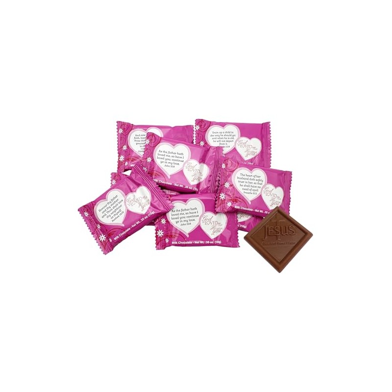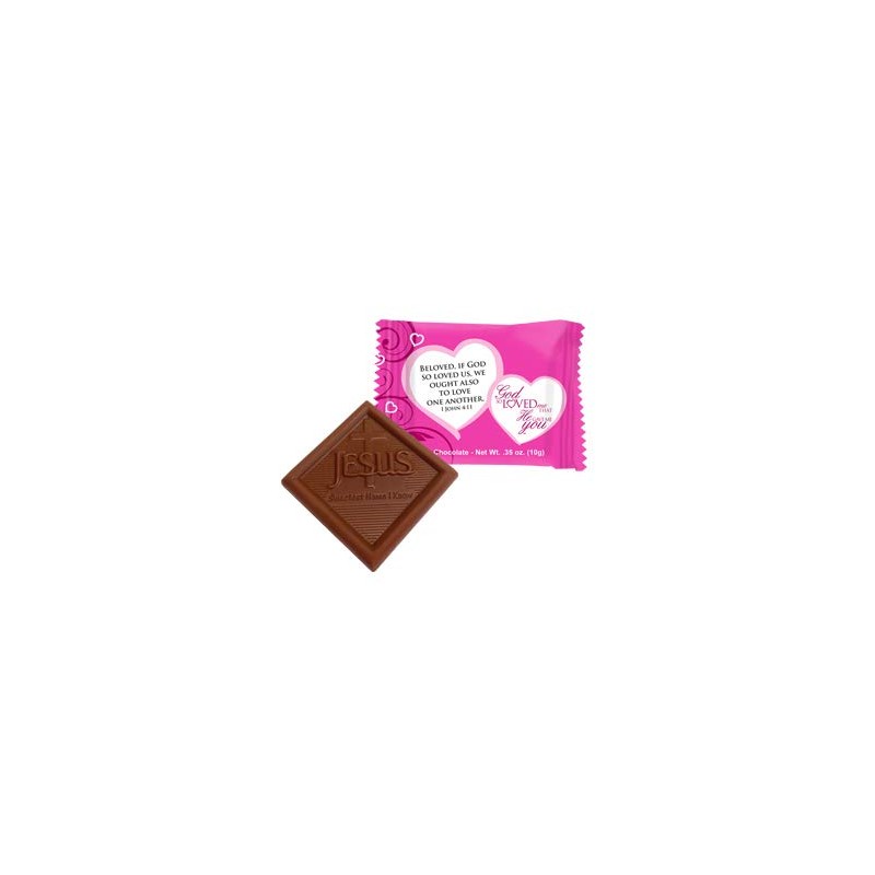 This delightful tin is a new addition to our Valentine's Day line. This tin is decorated in a "Love is Patient, Love is Kind" theme on the outside. Filled with 9 pieces of our delicious milk chocolate squares. Our chocolates are embossed with "Jesus Sweetest Name I Know" and individually wrapped in pink foil that features a scripture.