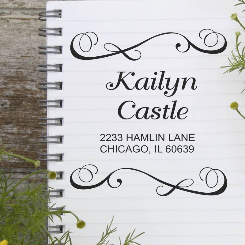 Scroll Border Bellevue Customized Name and Address Stamper for Envelopes, Square Imprint, Size 1-5/8", Holiday Cards, Party Invitations, Creative Gift, Uses Stamp Pad