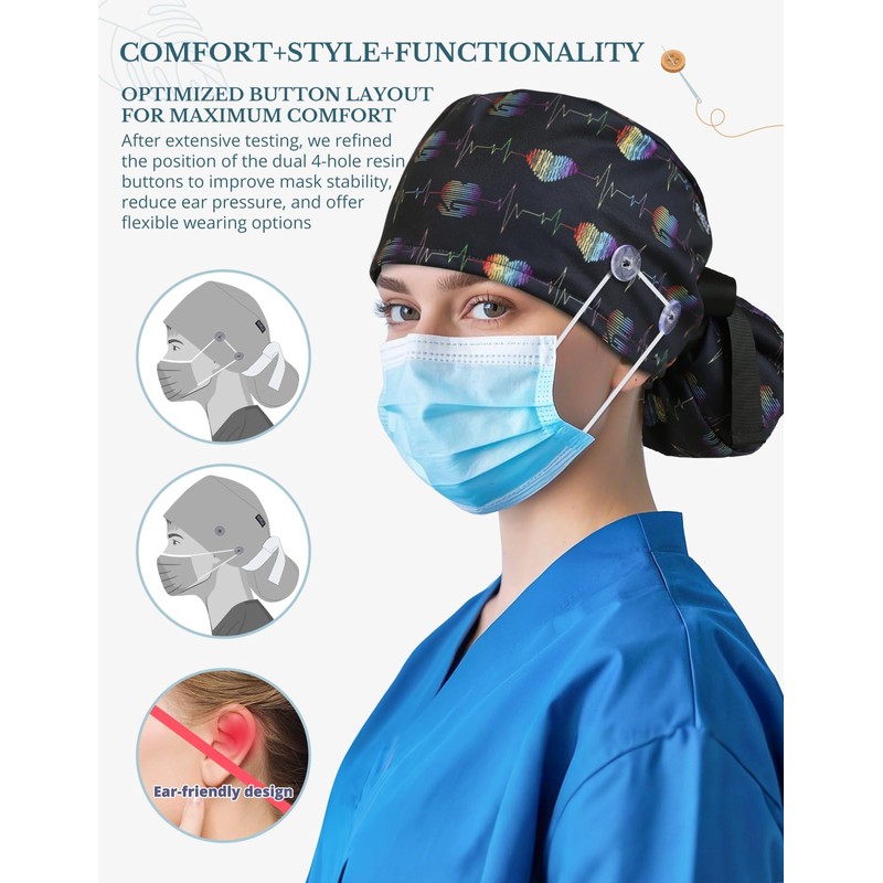 - Each side of the surgical caps for women ponytail is equipped with two high-quality resin buttons, diagonally stitched for both durability and a refined appearance. The button placement has been carefully tested for comfort and stability when securing mask straps, relieving pressure on the ears for all-day wear